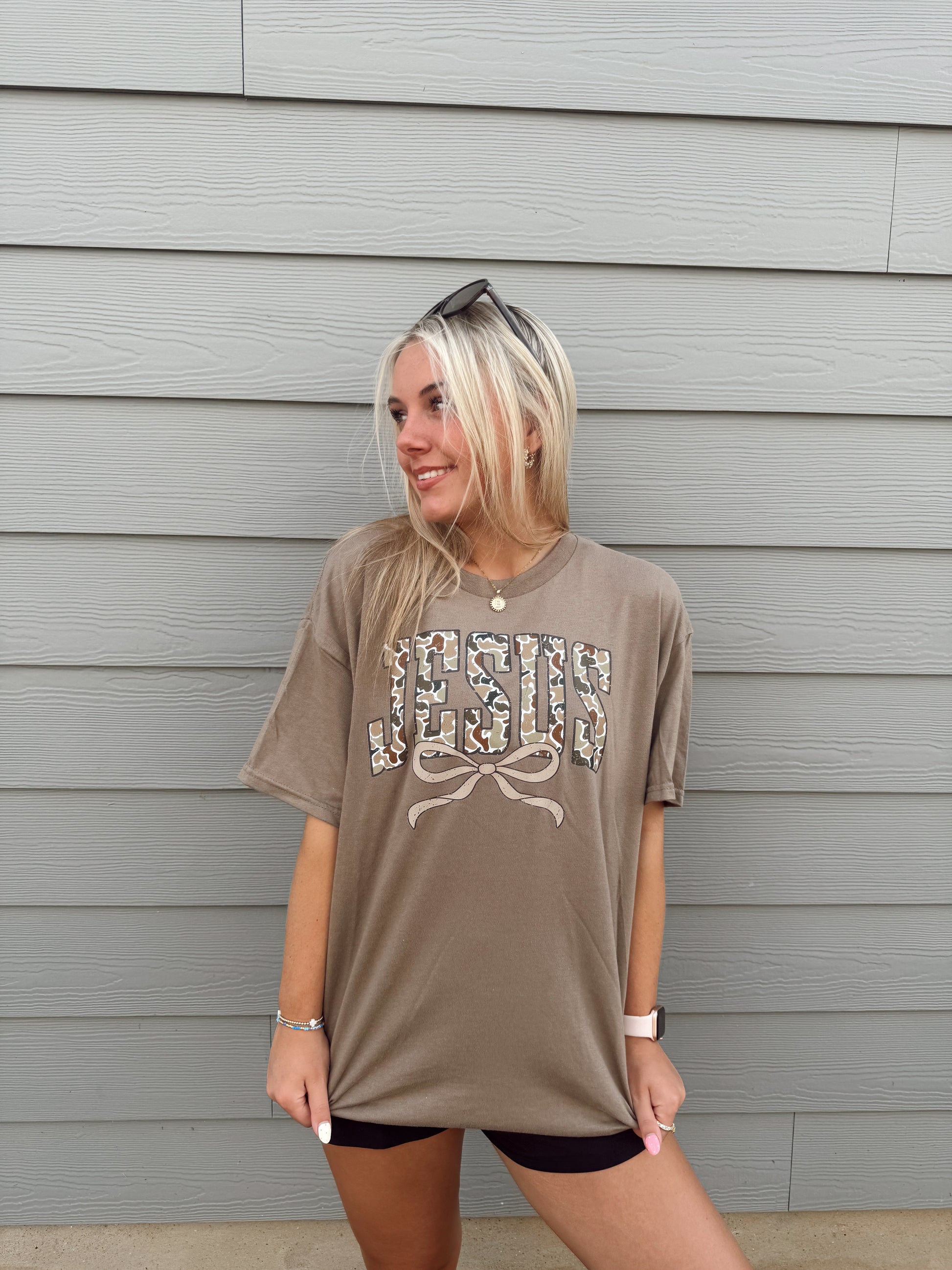 Show your playful faith with the Jesus Bow Graphic Tee. Made from soft Comfort Colors fabric, this tee combines comfort with a fun design that celebrates grace and style. Perfect for adding a lighthearted, uplifting touch to your casual wardrobe.